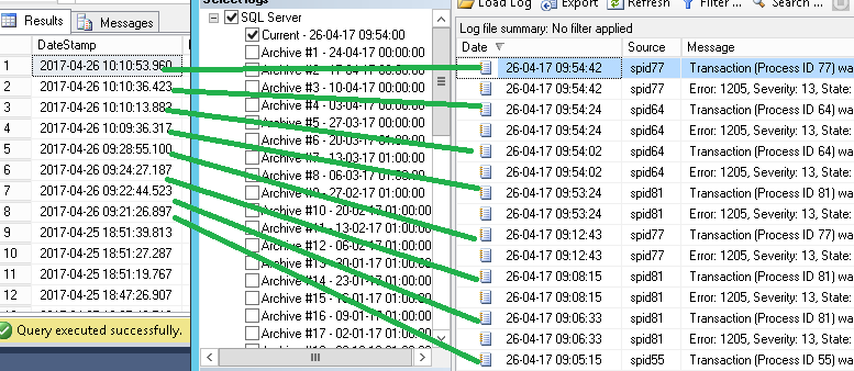 Esta instrucción le indicará a SQL Server que registre cualquier mensaje de error 1205 en el registro de errores de SQL Server. Usando el procedimiento almacenado xp_readerrorlog entonces nosotros podremos leer este registro y recuperar solo los registros de error 1205