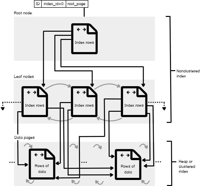 Un índice no agrupado es construido usando la misma página de 8K con estructura B-Árbol que es usada para construir los índices Agrupados, excepto que la información y los índices No agrupados están hechos de páginas índice en vez de páginas de información. Las páginas de índice de los índices No agrupados contienen valores de índices No agrupados clave con punteros para la localización de almacenaje de estas filas en las tablas montón subyacentes del índice Agrupado.
