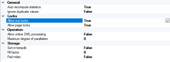 La pestaña Opciones de la ventana de dialogo Nuevo Índice te permite también configurar las diferentes opciones de creación de índice que controlan el rendimiento de la creación de índices, la cual es descrita profundamente en el artículo previo, como se muestra abajo: