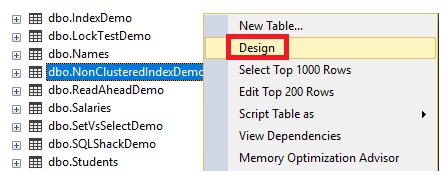 Otra forma de crear índices No agrupados usando SSMS es usar la Tabla Designer. Abre la tabla donde el índice será creado y luego apretar clic derecho en esa tabla y escoge la opción Design como se muestra abajo: