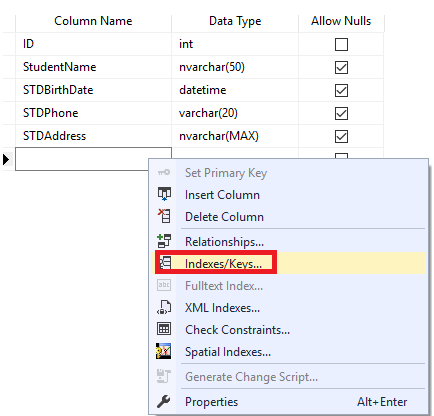 De la ventana abierta Tabla Designer, apretar clic derecho en cualquier parte y escoge la opción Índices/Claves para abrir la ventana de dialogo creación de índice, como se muestra abajo:
