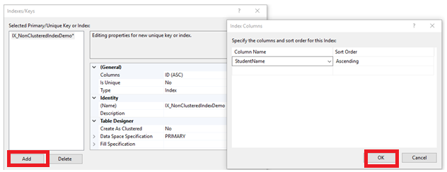 En la ventana abierta, apretar clic en el botón Añadir para añadir un nuevo índice No agrupado. Configura la opción Crear Como Agrupado como “No”, provee un nombre para el índice, si los valores clave de los índices No agrupados serán únicos o no, la columna o columnas que van a participar en el índice clave, con el orden requerido, como se muestra claramente abajo: