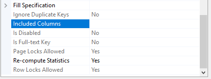 De la misma ventana, expande las Especificaciones de relleno para especificar las columnas no-clave que serán incluidas en los índices No agrupados y las opciones diferentes de creación de índice, como se muestra abajo: