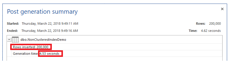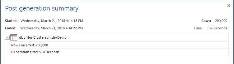 Después llenaremos la tabla montón con 200 mil filas, usando ApexSQL Generate. Verás que tomará 4.53 segundos en llenar la tabla, como se muestra abajo: