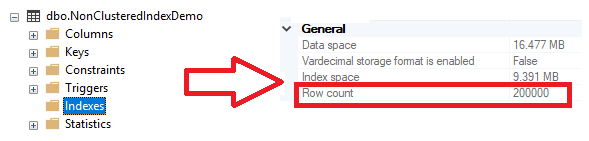 La tabla montón NonClusteredIndexDemo esta lista ahora, llenada con 200 mil filas y no tiene índice creado en esta tabla, asumiendo que la declaración CREATE INDEX previa no es ejecutada, como se muestra abajo:
