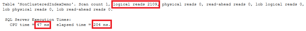 Las estadísticas TIME y IO muestran que 2109 operaciones lógicas leídas, 47 ms del tiempo de CPU consumidos en 204 ms de tiempo para recuperar la información requerida como se muestra en la captura de pantalla de abajo: