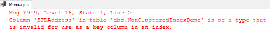 La declaración CREATE INDEX fallará, mientras la columna STDAddress, con información tipo NVARCHAR(MAX), no puede ser añadida al índice No agrupado como columna clave, como se muestra en el mensaje de error de abajo: