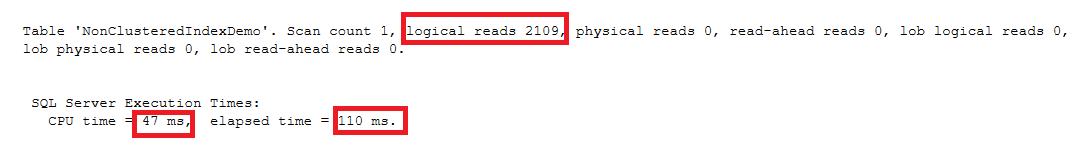 Verificando las estadísticas TIME e IO, verás que 2109 operaciones lógicas leídas son realizadas, 47 ms del tiempo CPU son consumidos en 110 ms de tiempo para recuperar la información requerida, lo cual es de algún modo similar a los valores generados después de recuperar la información sin un índice, pero un poco más rápido como se muestra en la captura de pantalla de abajo: