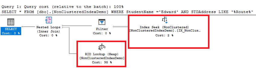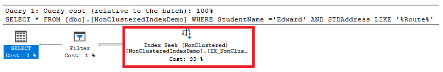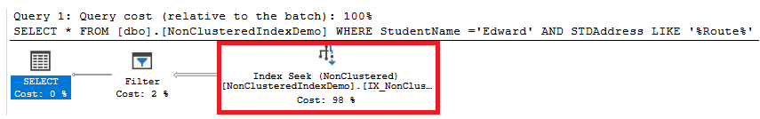 SET STATISTICS TIME ON SET STATISTICS IO ON SELECT * FROM [dbo].[NonClusteredIndexDemo] WHERE StudentName ='Edward' AND STDAddress LIKE '%Route%' |