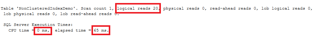 Las estadísticas TIME e IO mostrarán que solo 20 operaciones lógicas leídas son realizadas, 0 ms del tiempo de CPU es consumido en 65 ms de tiempo para recuperar la información requerida, lo cual es claramente mejor que usar un índice No agrupado que no cubre todas las columnas requeridas, como se muestra en la captura de pantalla de abajo: