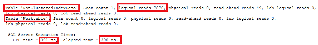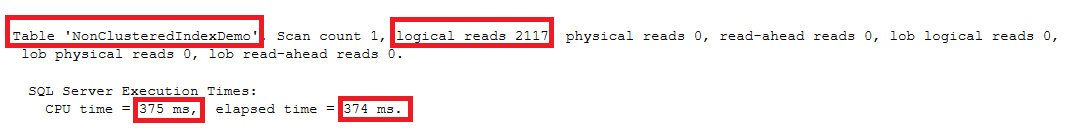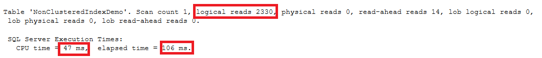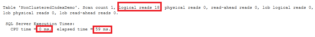 Puedes ver de las estadísticas TIME e IO que solo 18 operaciones lógicas leídas son realizadas, 0 ms del tiempo de CPU es consumido en 59 ms de tiempo para recuperar la información requerida, que es obviamente más rápido que usar un índice No agrupado que no cubre todas las columnas requeridas, como se muestra en la captura de pantalla de abajo: