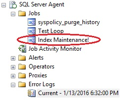 Un enfoque alternativo integrado es el trabajo paralelo, el cual corre periódicamente y revisa que nuestros trabajos de mantenimiento estén operando dentro de los parámetros. Si cualquier situación inaceptable es detectada, el trabajo responsable puede ser forzado a terminar. Esto es muy útil si el trabajo problemático está trabado en una operación grande y no puede alcanzar uno de los puntos de verificación que creamos en nuestros ejemplos anteriores. Para ilustrar esto, he creado un trabajo que corre el procedimiento almacenado de mantenimiento de índice mencionado anteriormente: