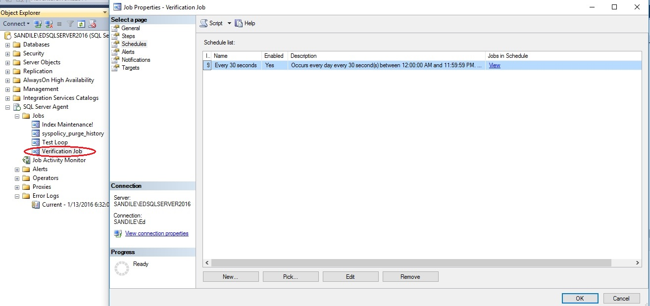 Luego crearemos un trabajo que corre cada 30 segundos y llama al anterior procedimiento almacenado: