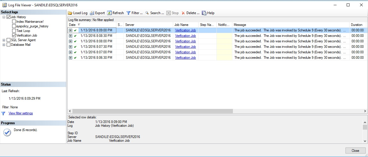 Como se esperaba, este proceso de verificación no necesita ni siquiera un segundo para completarse, dado que sólo está verificando el disco y los metadatos de los trabajos y puede hacerlo de manera rápida y eficiente. Digamos que yo estaba a punto de iniciar mi trabajo de mantenimiento de índice y revisarlo de nuevo en 30 segundos: