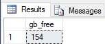 USE DBTest; SELECT CAST(CAST(available_bytes AS DECIMAL) / (1024 * 1024 * 1024) AS BIGINT) AS gb_free FROM sys.master_files AS f CROSS APPLY sys.dm_os_volume_stats(f.database_id, f.file_id) WHERE f.database_id = DB_ID() AND f.type_desc = 'ROWS'; |
