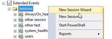 Figura 2. La lista de Sesiones de Evento Haga clic derecho en Sessions y seleccione New Session Wizard (usted podría crear sus eventos usando la opción New Session, pero el asistente es siempre una buena opción para principiantes):