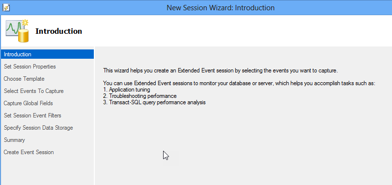 En SQL Server 2008, era sólo posible crear eventos XE usando T-SQL. Era una opción poco amigable que a nadie le gustaba. En las nuevas versiones de SQL, usted puede fácilmente crear su XE usando SQL Server Management Studio en la Interfaz de Usuario.