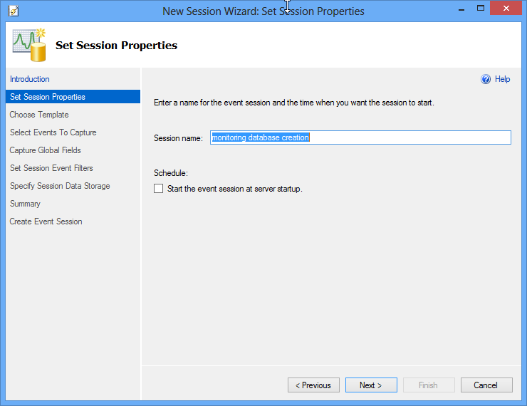 Figura 4. Introducción al asistente de Sesiones En Set Session Properties, especifique un nombre para la sesión. Usted también puede establecer la opción para iniciar la sesión al inicio del servidor: