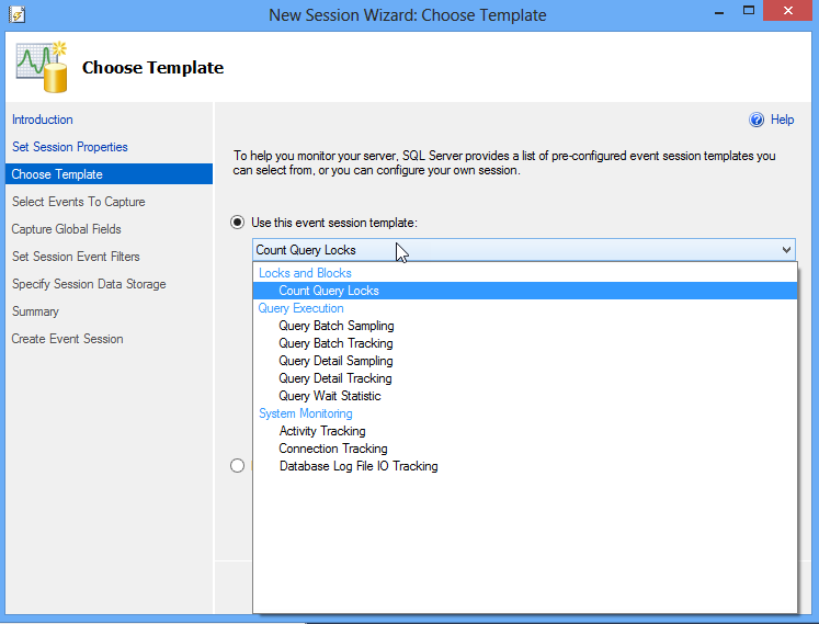 Figura 7. La opción para plantillas Una buena característica en XE que Profiler no tiene es la opción Search Event. Usted puede fácilmente buscar sus eventos aquí. En Select Events to Capture, usted puede seleccionar los eventos a capturar. Usted tiene más eventos que Profiler aquí. Por ejemplo, hay eventos Azure y ColumnStore. En este ejemplo seleccione la opción database_created. Esta opción generará un evento si una base de datos SQL Server es creada: