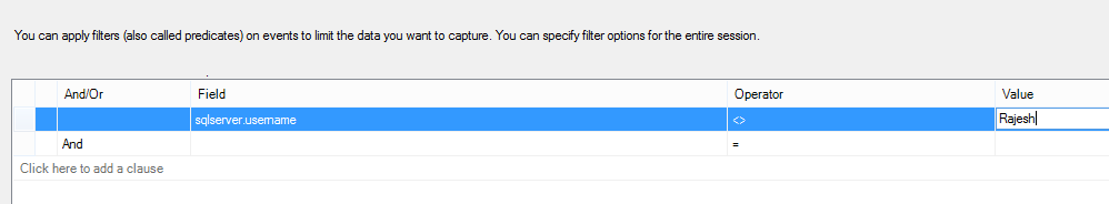 Figura 9. Campos globales Usted puede crear filtros para sus eventos usando ‘y’, ‘o’ con diferentes operadores. En este ejemplo especificamos que el nombre de usuario de SQL Server debería ser diferente que Rajesh: