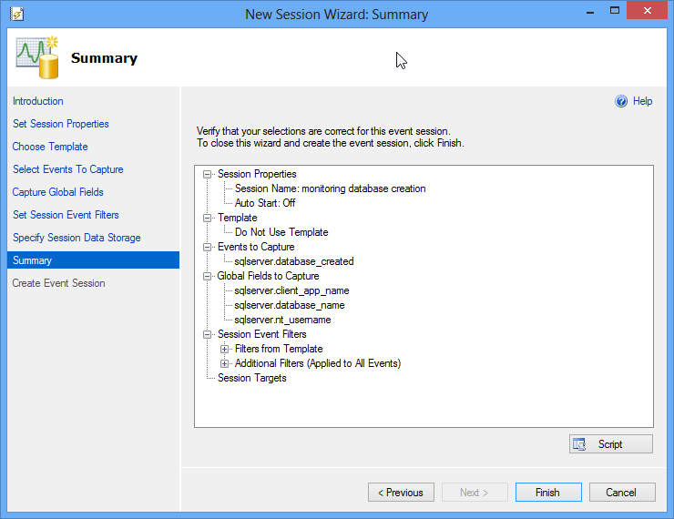 Primero crearemos el XE y luego crearemos la base de datos para verificar que el evento fue almacenado y detectado.