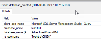 Figura 17. Evento de creación de base de datos Usted puede también ver el nombre usado de la aplicación cliente (SSMS), el nombre de la base de datos y el Usuario Windows. Estos son los campos seleccionados en la figura 9: