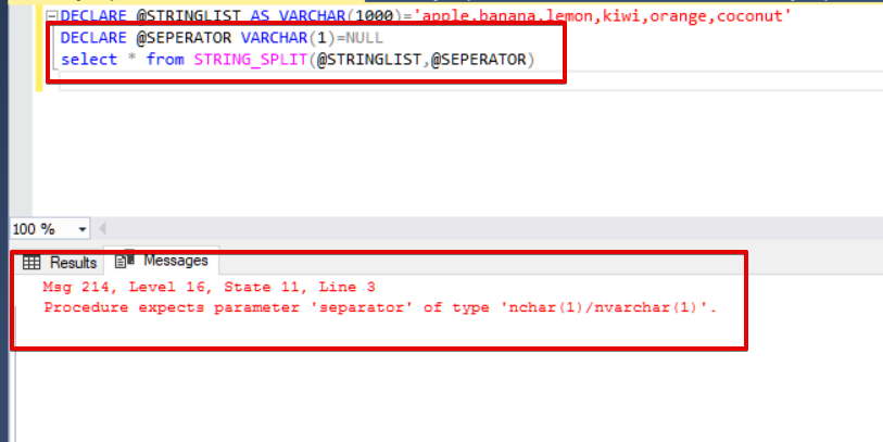 “El procedimiento espera el parámetro ‘separador’ del tipo ‘ nchar(1) / nvarchar (1)’”. La definición de error es muy clara e indica un problema relacionado con el tipo de datos del separador. Después de esta muestra, puede que aparezca una pregunta en su mente. ¿Podemos asignar un valor NULL al separador? Vamos a probar y aprender.