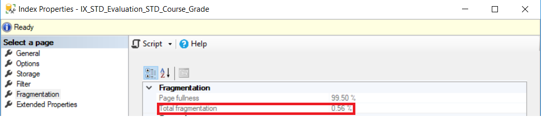 Por otro lado, configurando las opciones de creación de Fill Factor y pad_index con los valores apropiados ayudará a reducir la fragmentación de índice y problemas de división de página. Otras formas diferentes de obtener información de fragmentación sobre la base de datos de índices se puede realizar de diferentes formas, como consultar la función dinámica de administración sys.dm_db_index_physical_stats y el reporte standard Index Physical Statistics , que son mencionados en detalle en el artículo previo.