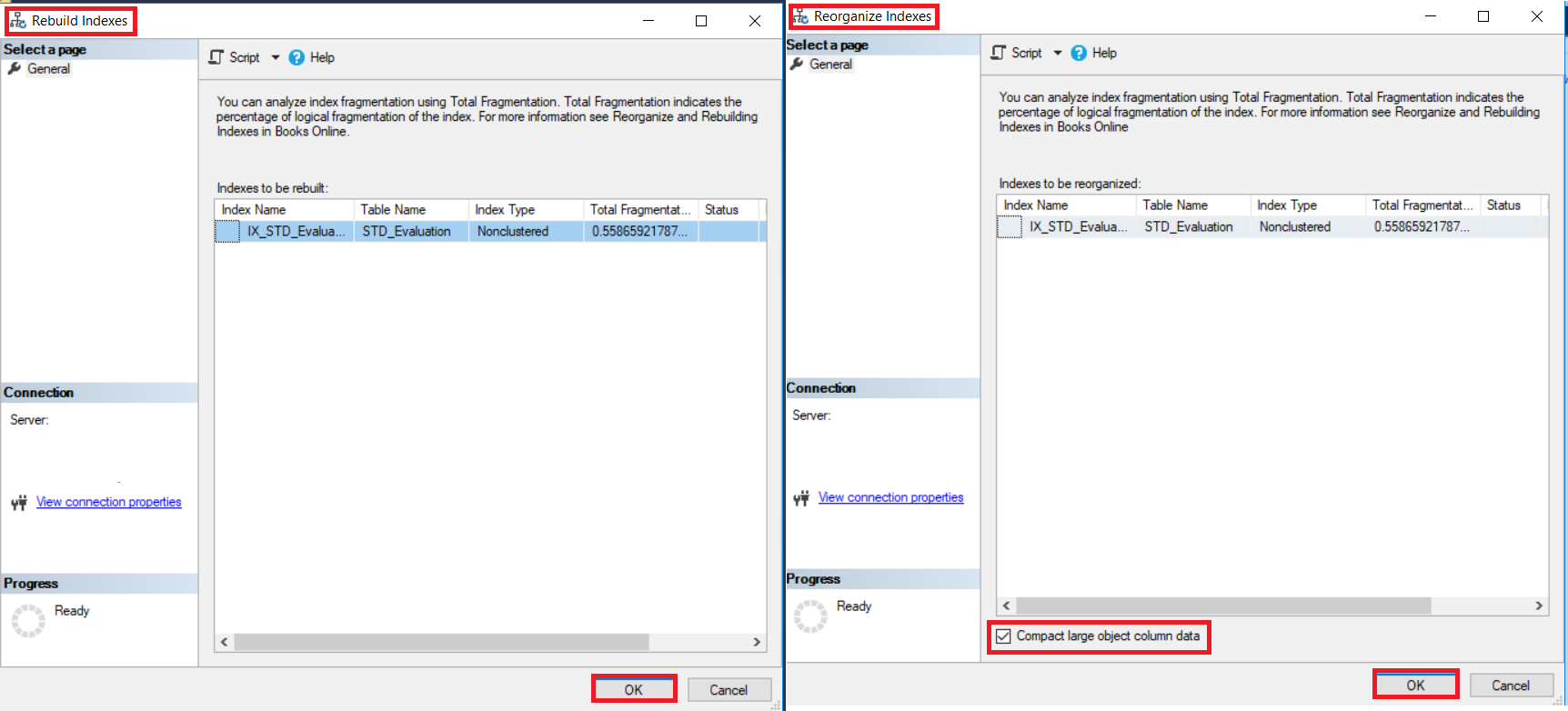 La ventana mostrada de reconstruir o reorganizar va a listar todas las tablas de índices que van a ser desfragmentados usando esa operación, con el nivel de fragmentación de cada índice, como se muestra en la captura de pantalla de abajo: