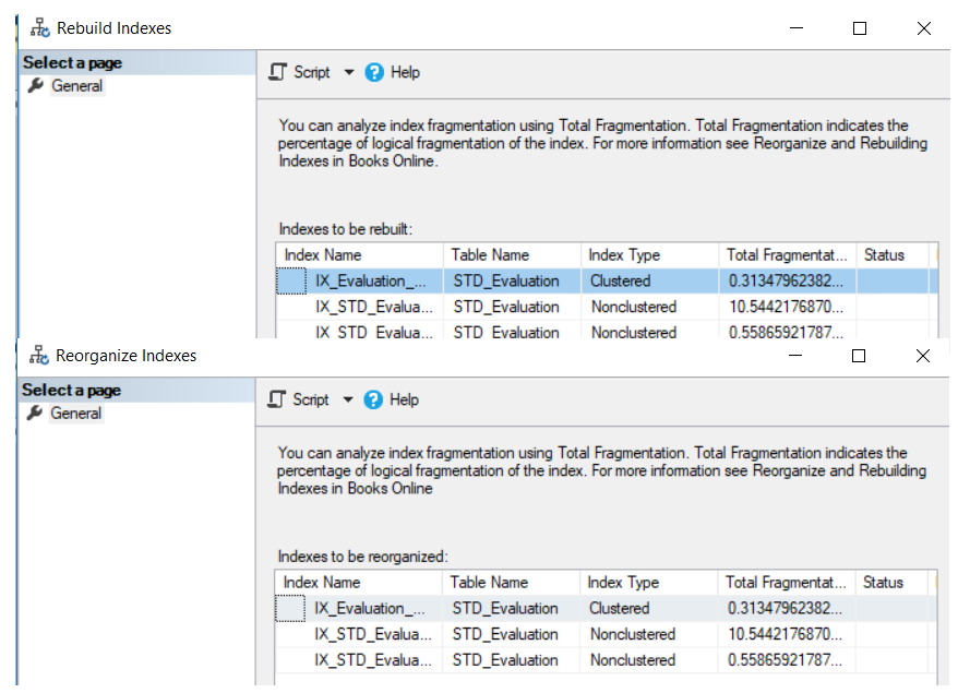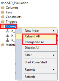 ALTER INDEX ALL ON [dbo].[STD_Evaluation] REORGANIZE ; GO |