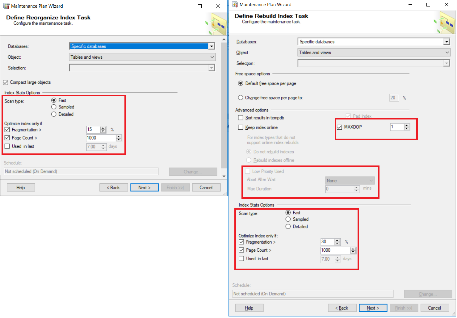 Usando los SQL Server Maintenance Plans para automatizar las áreas de mantenimiento de índices no es una opción preferida cuando se usa versiones SQL Server anterior a 2016, debido a la falta de control en estas pesadas operaciones. Esto es debido a que estas tareas de mantenimiento serán realizadas en todas las tablas o índices de base de datos independientemente del porcentaje de fragmentación de estos índices. Esas operaciones van a requerir una ventana de largo manteamiento y va a consumir intensivamente los recursos del servidor cuando se mantiene grandes bases de datos.