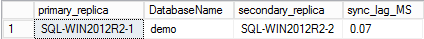 ;WITH AG_Stats AS ( SELECT AR.replica_server_name, HARS.role_desc, Db_name(DRS.database_id) [DBName] FROM sys.dm_hadr_database_replica_states DRS INNER JOIN sys.availability_replicas AR ON DRS.replica_id = AR.replica_id INNER JOIN sys.dm_hadr_availability_replica_states HARS ON AR.group_id = HARS.group_id AND AR.replica_id = HARS.replica_id ), Waits AS ( select wait_type , waiting_tasks_count , wait_time_ms , wait_time_ms/waiting_tasks_count sync_lag_MS from sys.dm_os_wait_stats where waiting_tasks_count >0 and wait_type = 'HADR_SYNC_COMMIT' ), Pri_CommitTime AS ( SELECT replica_server_name , DBName FROM AG_Stats WHERE role_desc = 'PRIMARY' ), Sec_CommitTime AS ( SELECT replica_server_name , DBName FROM AG_Stats WHERE role_desc = 'SECONDARY' ) SELECT p.replica_server_name [primary_replica] , w.sync_lag_MS FROM Pri_CommitTime p CROSS APPLY Waits w |