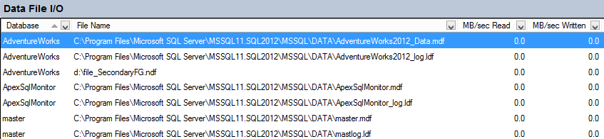 Para ver el panel Data File I/O, aparte de VIEW SERVER STATE, el inicio de sesión debe tener los permisos CREATE DATABASE, ALTER ANY DATABASE o VIEW ANY DEFINITION.