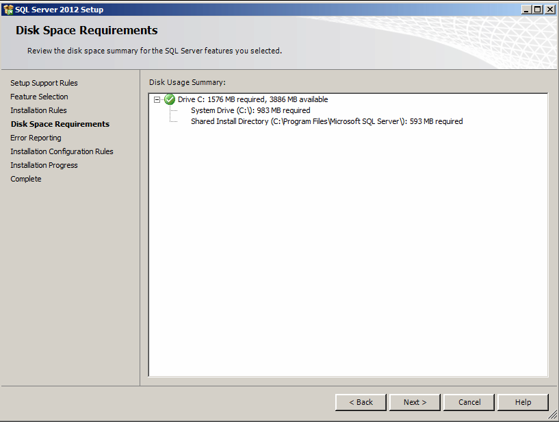 En este paso la configuración de SQL Server Management Studio (SSMS) verificará el espacio del disco. Por favor asegúrese de que tiene suficiente espacio de disco disponible. No tener suficiente espacio de disco puede resultar en fallas en la instalación. Haga clic en el botón Next para continuar.