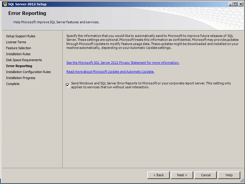 En este paso, usted tiene la oportunidad de decidir si mandar o no notificaciones de error a Microsoft. Esto es altamente recomendado para ayudar a Microsoft a mejorar futuros lanzamientos y para solucionar errores en el lanzamiento existente.