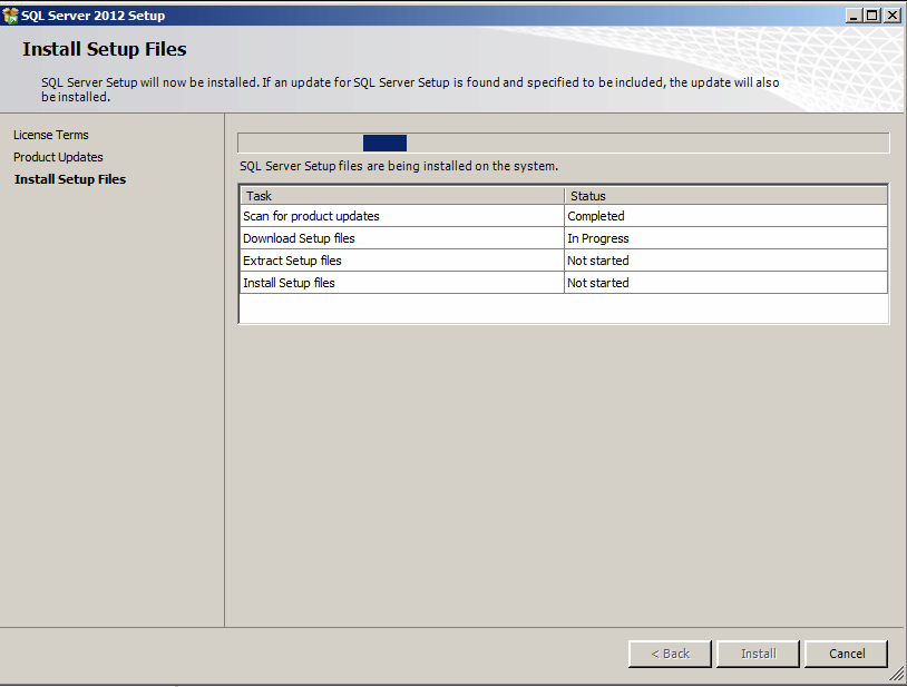 El siguiente paso es Install Setup Files, donde la configuración de SQL Server Management Studio (SSMS) descargará e instalará todos los archivos de configuración necesarios para su servidor.