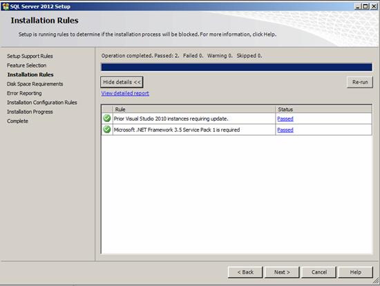 En este paso, SQL Management Studio (SSMS) verificará las reglas de instalación (pre requisito para SSMS). Sólo haga clic en el botón Next para continuar.
