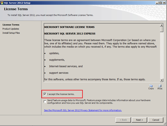 Una vez que seleccione la opción “New SQL Server stand-alone installation or add features to an existing installation”, tal opción seleccionará las reglas de configuración (pre-requisitos) en el servidor y lo llevará a la pantalla de términos de licencia. Los términos de licencia deben ser leídos y aceptados como los términos de cualquier otra aplicación. Por favor note que usted debe pasar las reglas de configuración para proceder con la instalación.