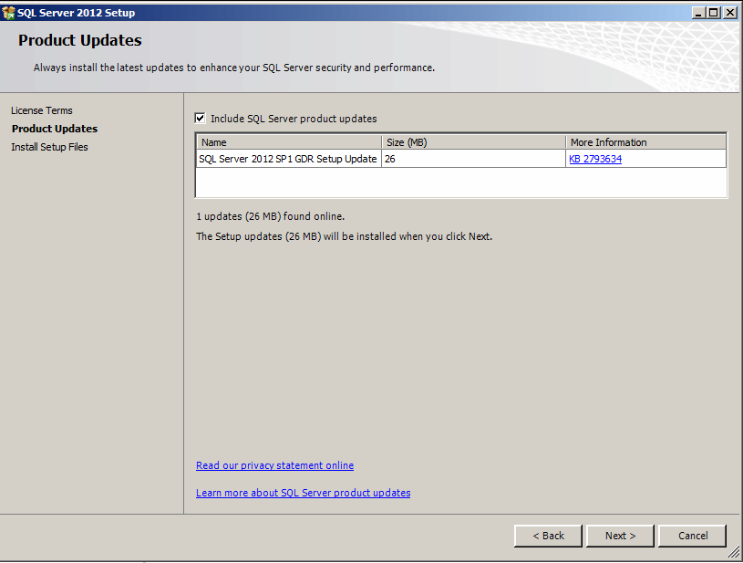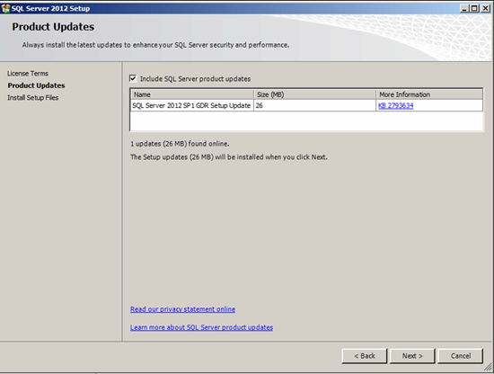 Una vez que acepta los términos de licencia, es tiempo de escanear todas las actualizaciones disponibles para el producto. Las actualizaciones requeridas, el tamaño y los detalles serán mostrados. De todas maneras, si usted necesita más detalles, usted puede seleccionar More Information, lo cual lo llevará a la página de soporte, donde usted encontrará todos los detalles relacionados a las actualizaciones. Usted puede ignorar estas actualizaciones deseleccionando la opción ‘Include SQL Server product updates’ en este punto.