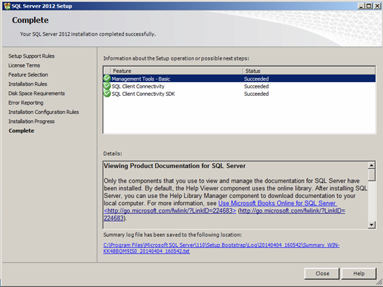 Este paso muestra el estado de instalación de SQL Server Management Studio (SSMS) junto con cada característica, como un resumen. Esta pantalla realmente ayuda a ver qué ha sido instalado y qué no. En el caso de que una de las características no pueda ser instalada, usted puede volver a correr el mismo procedimiento de instalación e instalar esa característica particular.