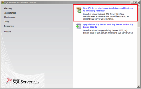 Una vez que ha descargado el archivo respectivo para su tipo de servidor, usted necesita ejecutarlo. Eso lo llevará a la primera pantalla llamada SQL Server Installation Center, como se muestra a continuación. Esta es la pantalla primaria de instalación de SQL Server. Otras instalaciones de herramientas de SQL Server pueden ser lanzadas desde aquí también. Una vez que esté en esta pantalla, usted necesita seleccionar “New SQL Server stand-alone installation or add features to an existing installation” para proceder con la instalación.