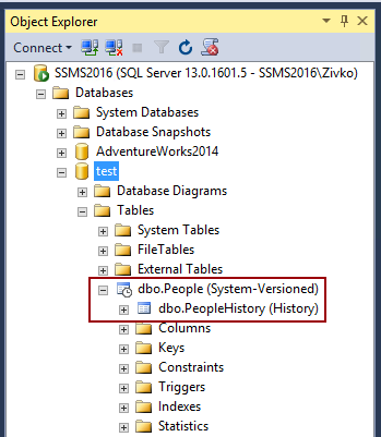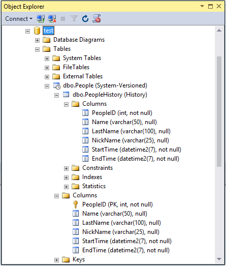 CREATE TABLE People( PeopleID int PRIMARY KEY NOT NULL, Name varchar(50) Null, LastName varchar(100) NULL, NickName varchar(25), StartTime datetime2 GENERATED ALWAYS AS ROW START NOT NULL, EndTime datetime2 GENERATED ALWAYS AS ROW END NOT NULL, PERIOD FOR SYSTEM_TIME (StartTime,EndTime) ) WITH (SYSTEM_VERSIONING = ON(HISTORY_TABLE = dbo.PeopleHistory));
