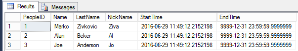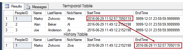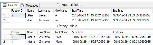 –Get the records from the temporal table SELECT p.* FROM dbo.People p –Get the records from the history table SELECT ph.* FROM dbo.PeopleHistory ph