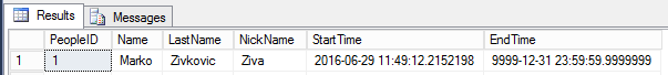 La tabla temporal (actual) que se actualiza y en la columna Hora de inicio se establece la hora en que se ejecuta la instrucción de actualización. De esta forma el sistema insertará automáticamente el registro en la tabla de historial con los datos que estaban antes de la actualización y en la columna Tiempo de finalización de la tabla de historial se insertará la hora en que se ejecute la instrucción de actualización. Intentemos actualizar la tabla de historial PeopleHistory y establecer NickName de Ziva a Maruska: