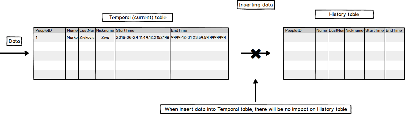 Al insertar datos en una tabla temporal, la tabla versionada del sistema (actual) se verá afectada, la tabla de historial estará vacía: