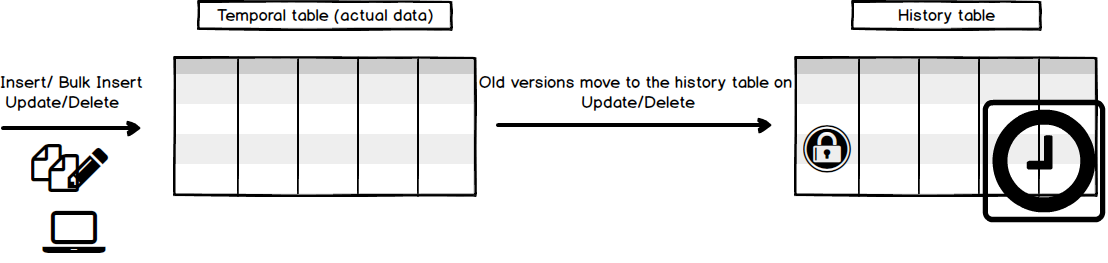 Las tablas temporales nos habilitan la posibilidad de recuperar datos de cualquier punto en el pasado y por cada cambio de datos (Actualizar, Eliminar, Combinar). Con la tabla temporal, los usuarios pueden restaurar datos de cambios accidentales (actualizar/eliminar), así como verificar todos los cambios en los datos, etc. La tabla temporal es una nueva característica de SQL Server disponible desde la versión CTP2 de SQL Server 2016. Una tabla temporal se compone de dos partes (tablas), la primera es la tabla en la que se habilita el seguimiento de datos y se llama una tabla versión original del sistema, esta tabla contiene datos actuales (reales), la segunda parte es la tabla en la que se almacenan los cambios de datos que se realizaron (Actualizar, Eliminar, Combinar) en una tabla con versión del sistema y se llama tabla de historial.