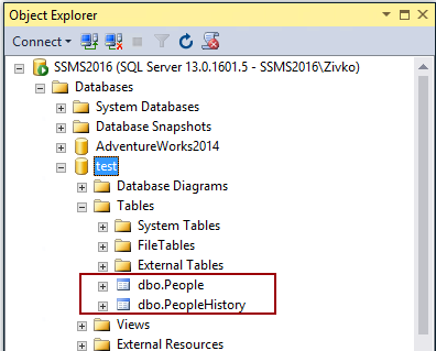 Después de ejecutar esta declaración, se producirá la tabla temporal de personas y se marcará como una tabla con versión del sistema. Dentro de la tabla de Personas se creará la tabla de Historia de Personas y se indicará como tabla de Historial: