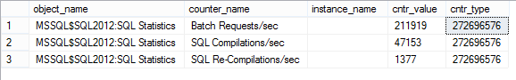 select * from sys.dm_os_performance_counters where counter_name in ('Batch Requests/sec', 'SQL Compilations/sec' , 'SQL Re-Compilations/sec') |