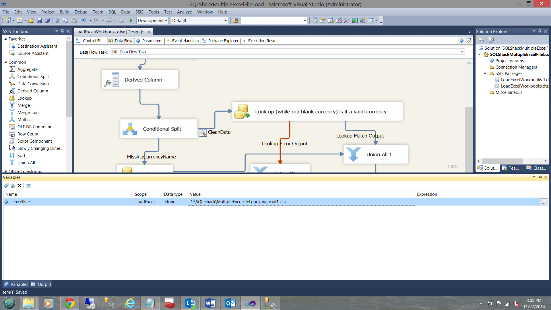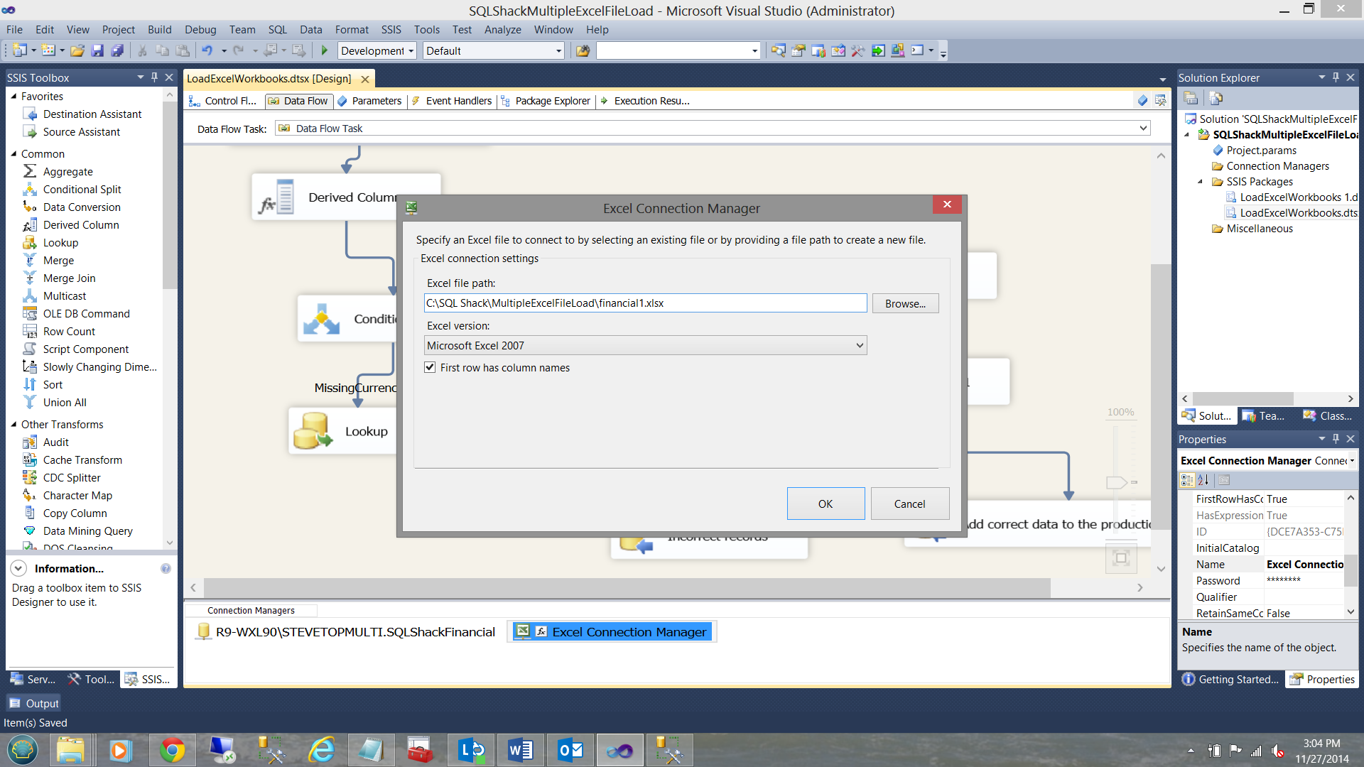Please note that I have renamed our SSIS package “LoadExcelWorkbooks” (see upper right).