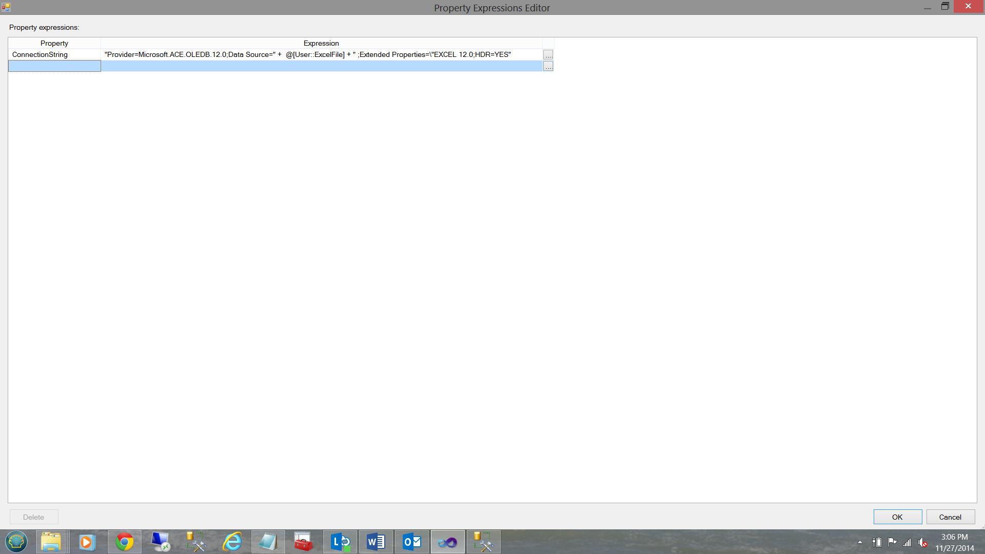 Once again we may access the Expression Property of the Excel connection string by right clicking on the excel connection (in the Connection Managers) and by selecting the Expressions property box and clicking the ellipsis (see below).